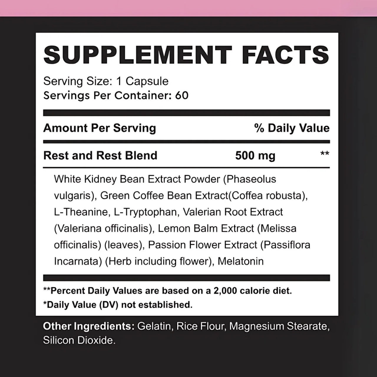 White Kidney Bean (Phaseolus vulgaris) Extract, Green Coffee Bean (Coffea robusta) Extract, L-Theanine, L-Tryptophan, Valerian (Valeriana officinalis) (root) Extract, Lemon Balm (Melissa officinalis) (aerial parts) Extract, Passion Flower (Passiflora incarnata) Extract, Melatonin, Vitamin D (as Cholecalciferol), Hypromellose (Capsule), Rice Flour, Magnesium Stearate, Silicon Dioxide.