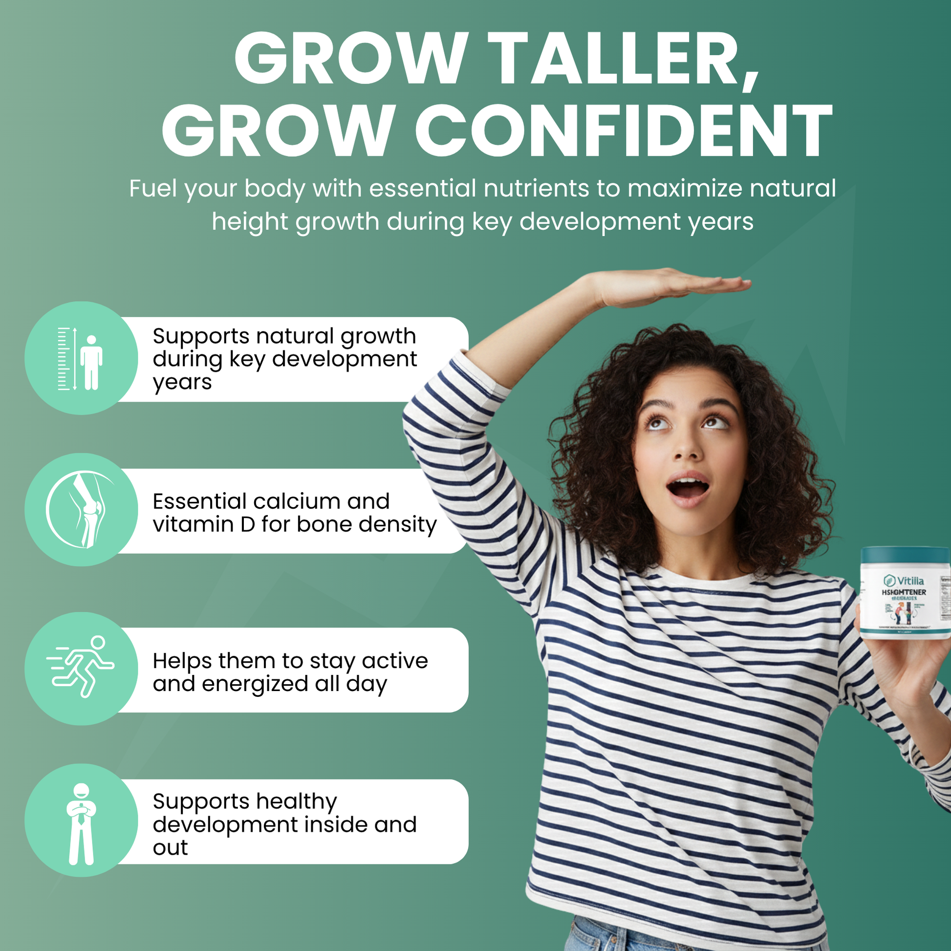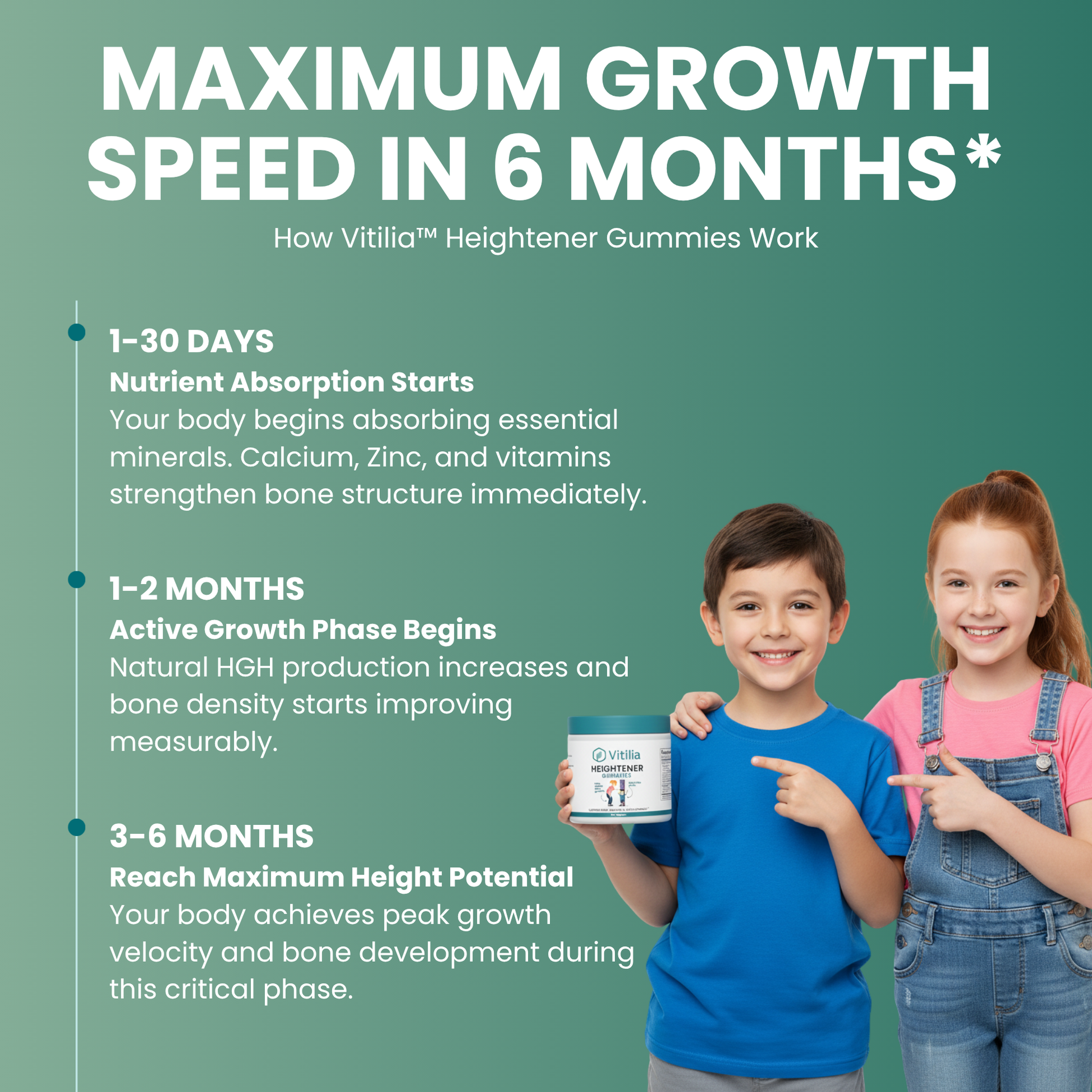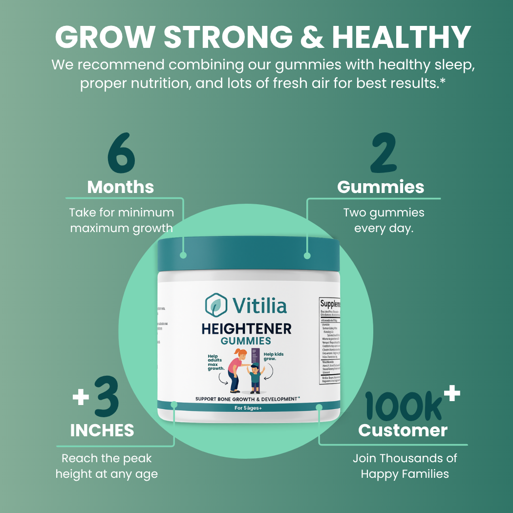 Noticeable height increase (1-2+ inches average for active growers). Growth plates stay open longer. Muscle development improves. Confidence transforms as kids catch up to peers. Doctor visits confirm improved growth percentiles.