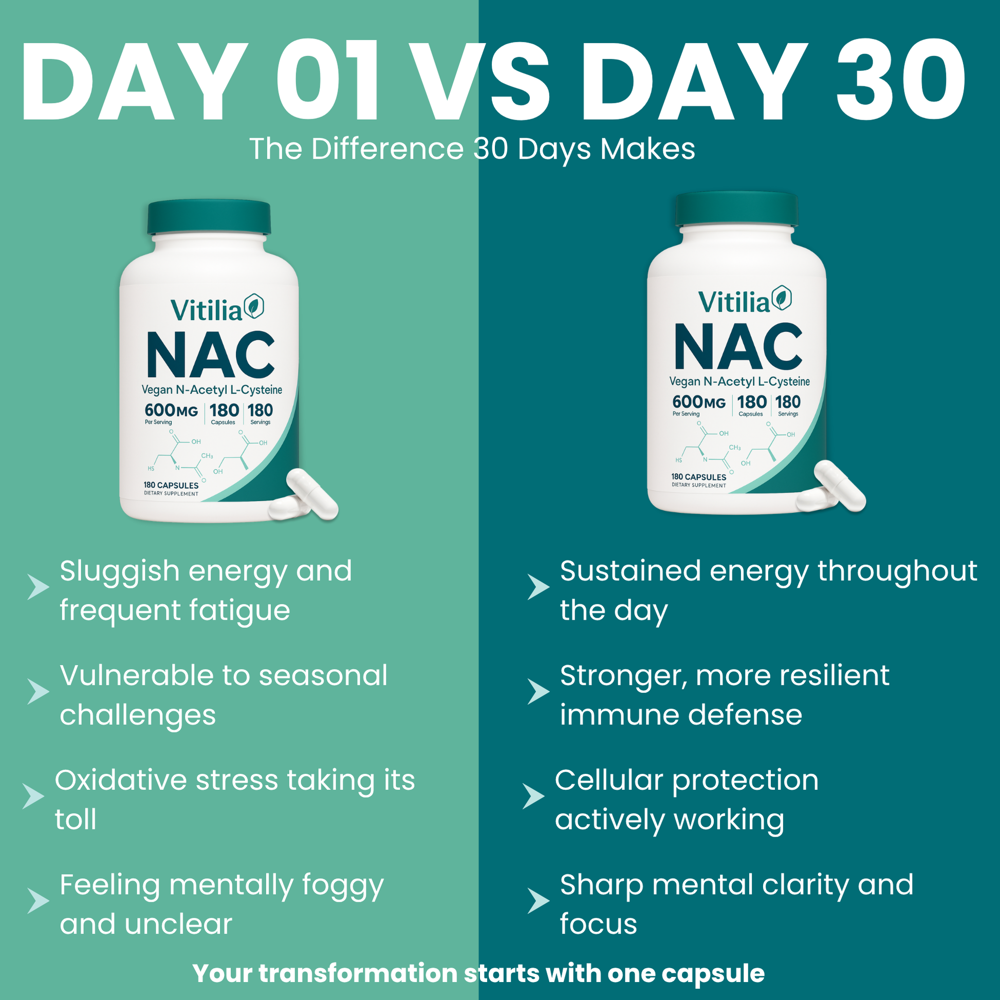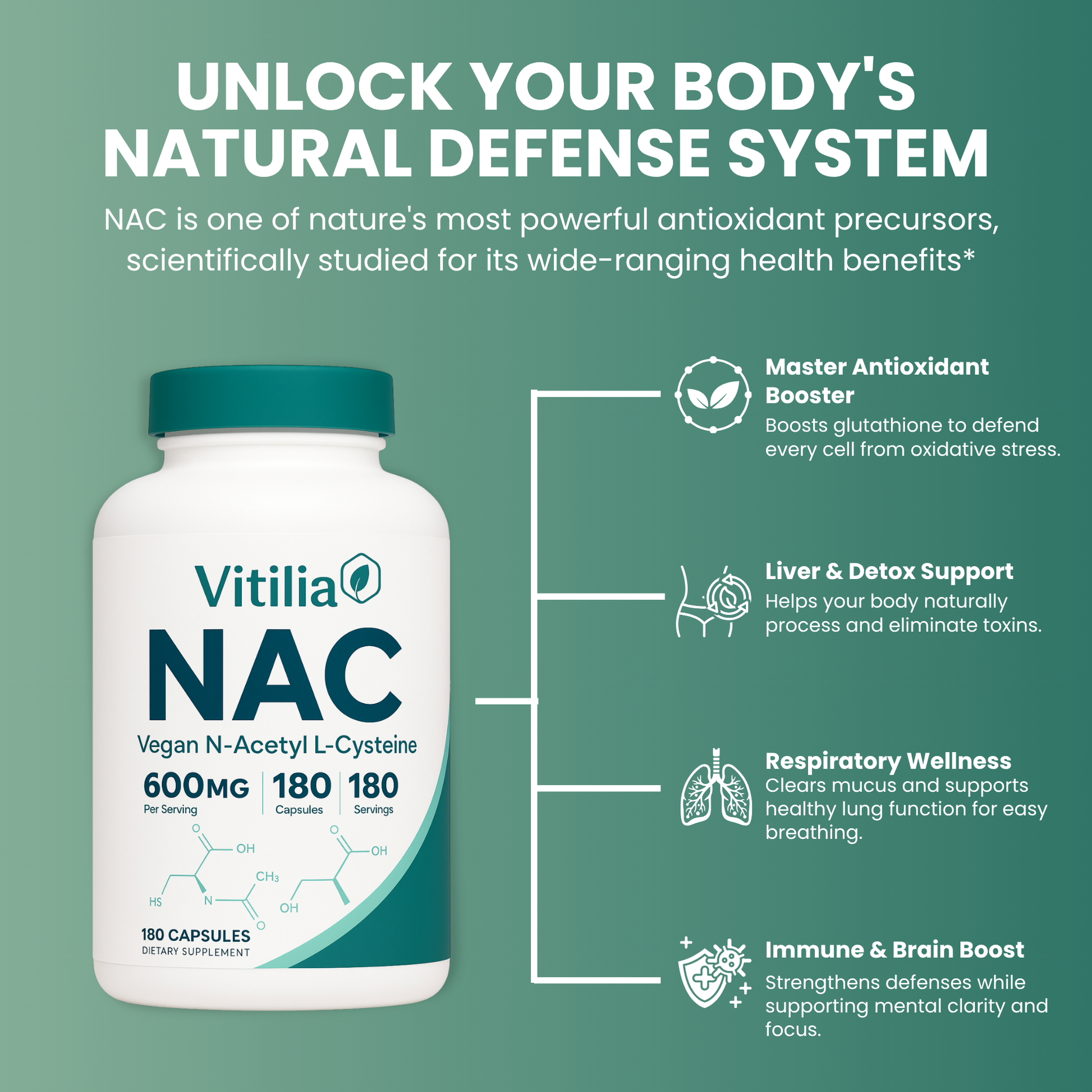 • Master Antioxidant Support for Radiant Wellness: Vitilia NAC helps your body produce glutathione - the most powerful antioxidant your cells create naturally. As we age and stress increases, glutathione levels drop, leaving us vulnerable to damage. Each 600mg capsule delivers pharmaceutical-grade NAC that replenishes these crucial antioxidants, protecting your cells and promoting radiant skin, sustained energy, and healthy aging from within.