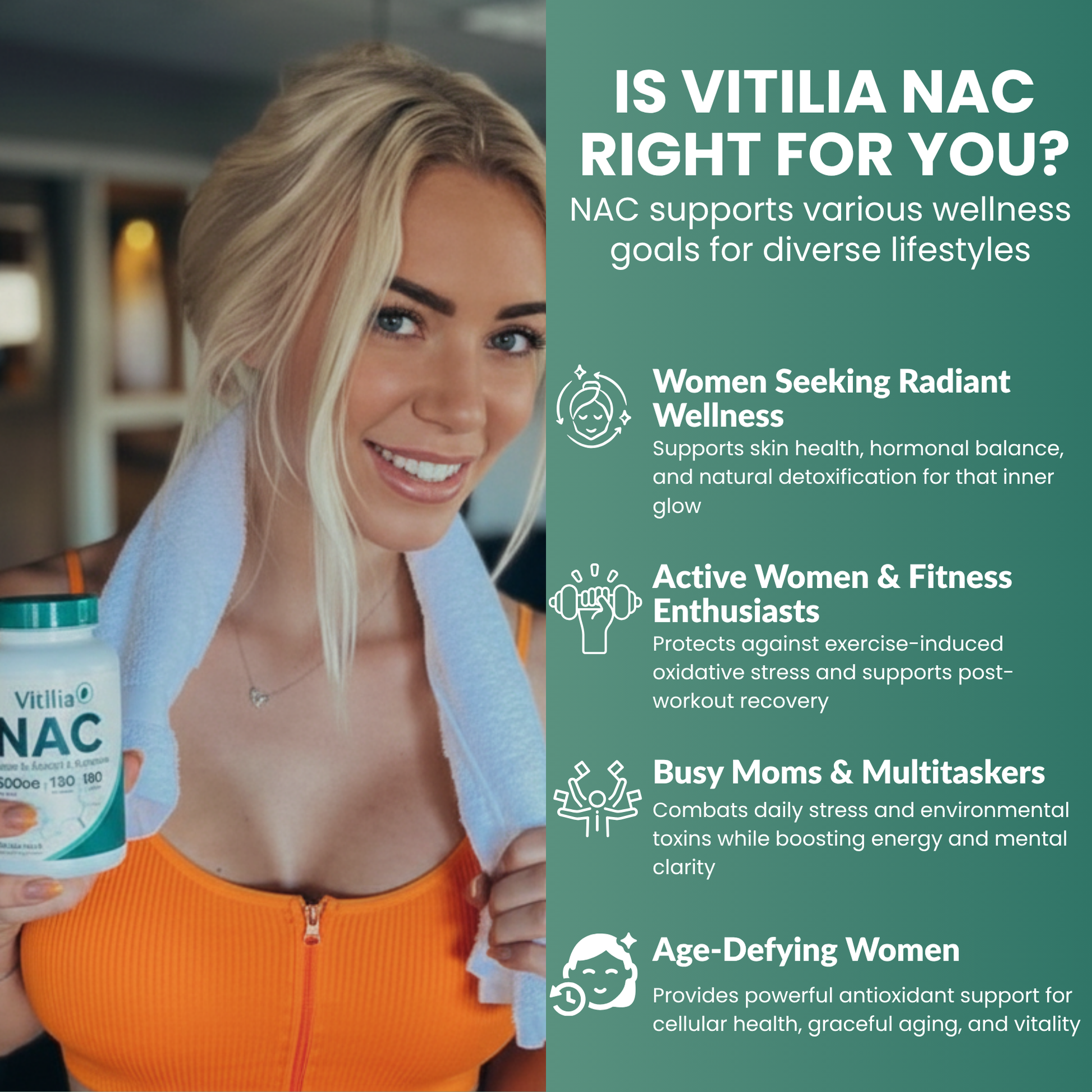 Our formula is designed for women who refuse to settle: busy professionals, active moms, wellness enthusiasts, and women committed to aging gracefully. Join thousands of women who've made Vitilia NAC their non-negotiable daily essential for radiant skin, boundless energy, and that unmistakable feeling of thriving from the inside out.