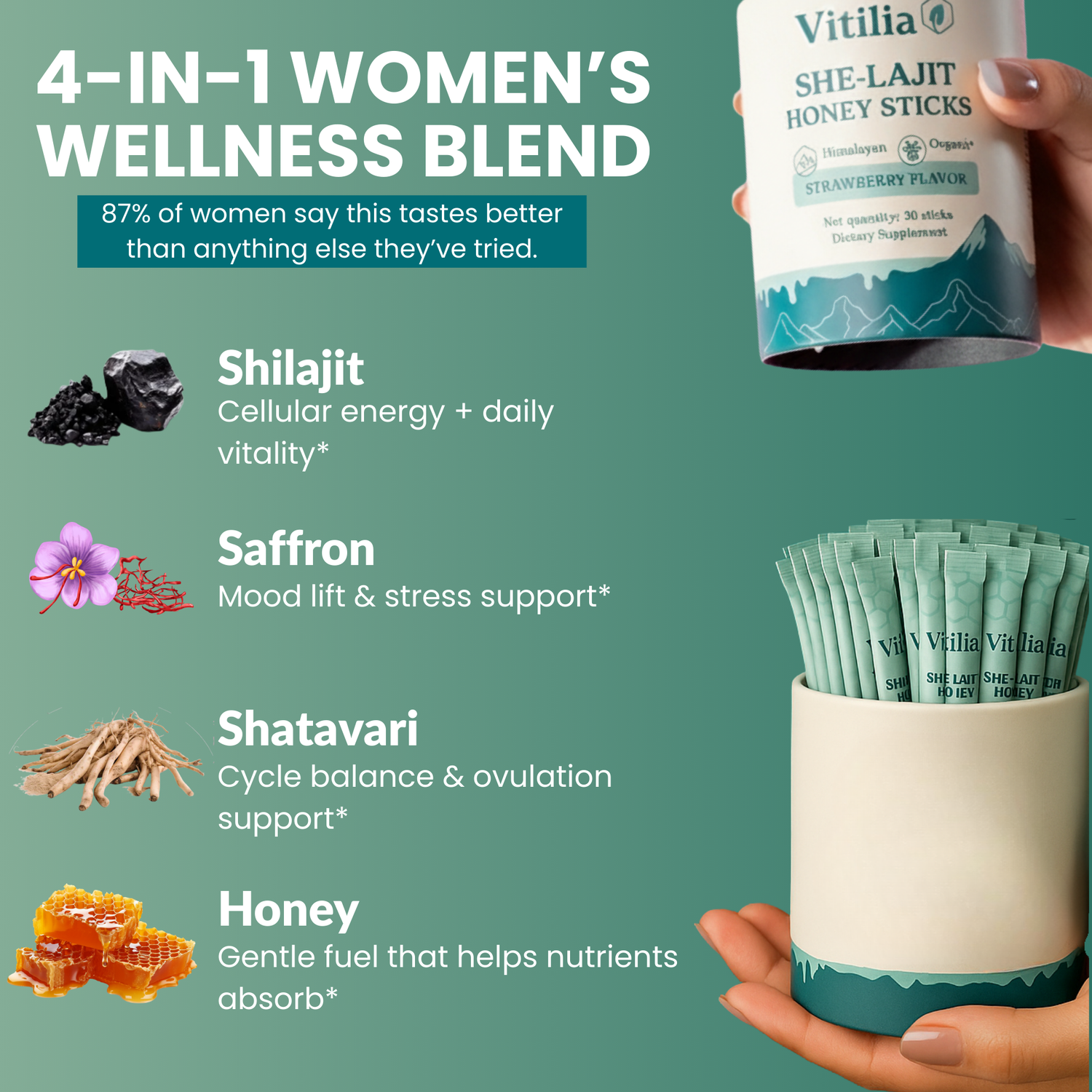 Each Vitilia SHE-Lajit Honey Stick blends purified Himalayan shilajit resin (rich in fulvic acid and trace minerals) with organic honey as a natural carrier. To support women’s health, the formula incorporates shatavari extract and saffron. Additional minor ingredients include the natural flavoring and light antioxidant preservatives. All ingredients are chosen to be clean and minimal - no artificial colors, fillers, or harsh additives.