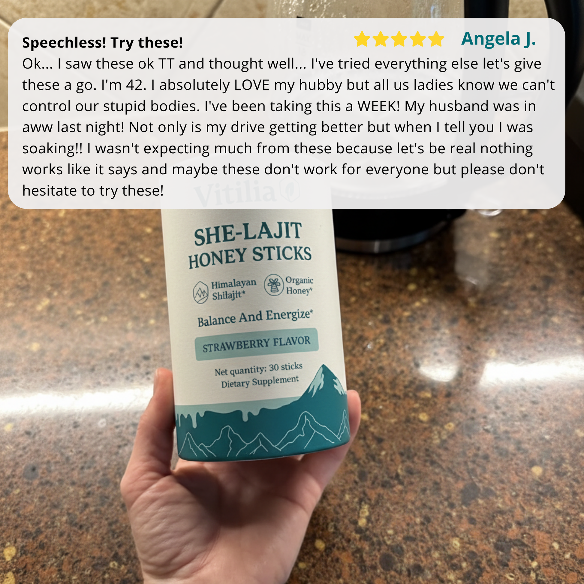 My body felt off for months. Low drive, dry, moody, tired. it put me back in my body. Energy feels clean, desire is alive, and intimacy is comfortable again. I did not think a daily honey stick could do all that, but here we are. I am giving four stars only because my order arrived a bit late.
