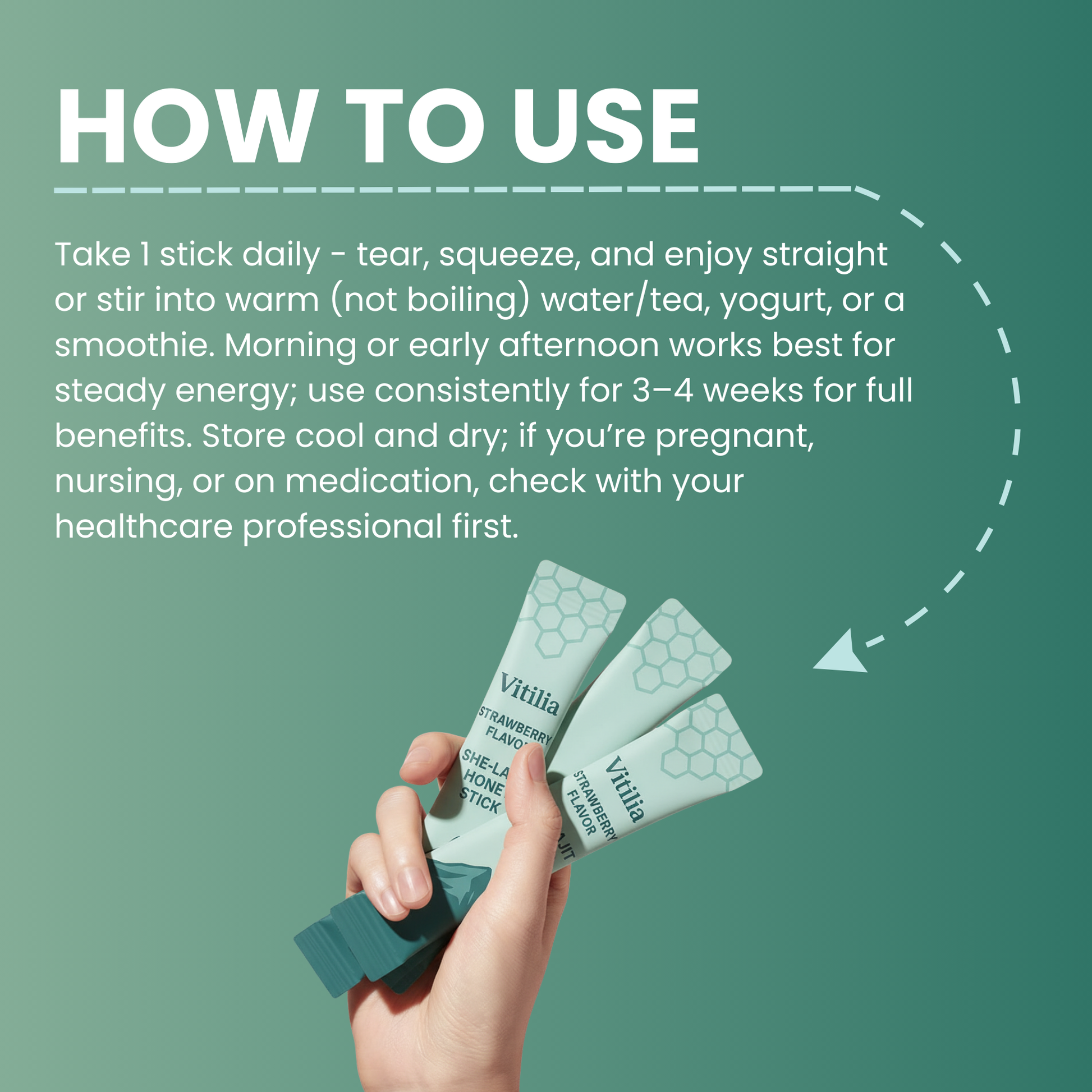 Take 1 stick daily, ideally in the morning. Tear open the sachet, squeeze the contents directly into your mouth or stir into warm (not boiling) water, tea, yogurt, or smoothies. For best results, maintain consistent daily use, many users begin noticing benefits within 3 to 4 weeks. Store in a cool, dry place away from direct sunlight.