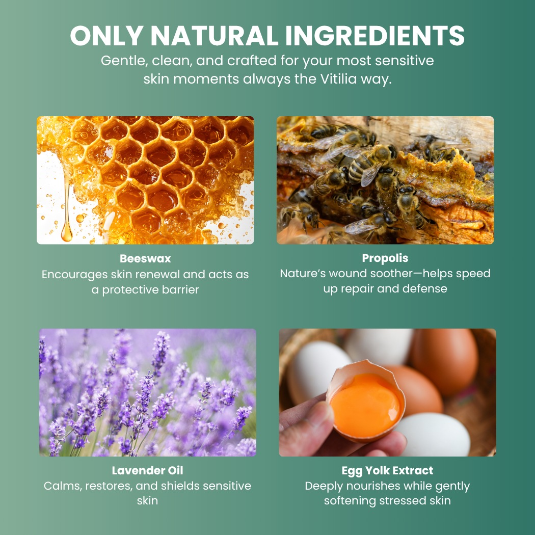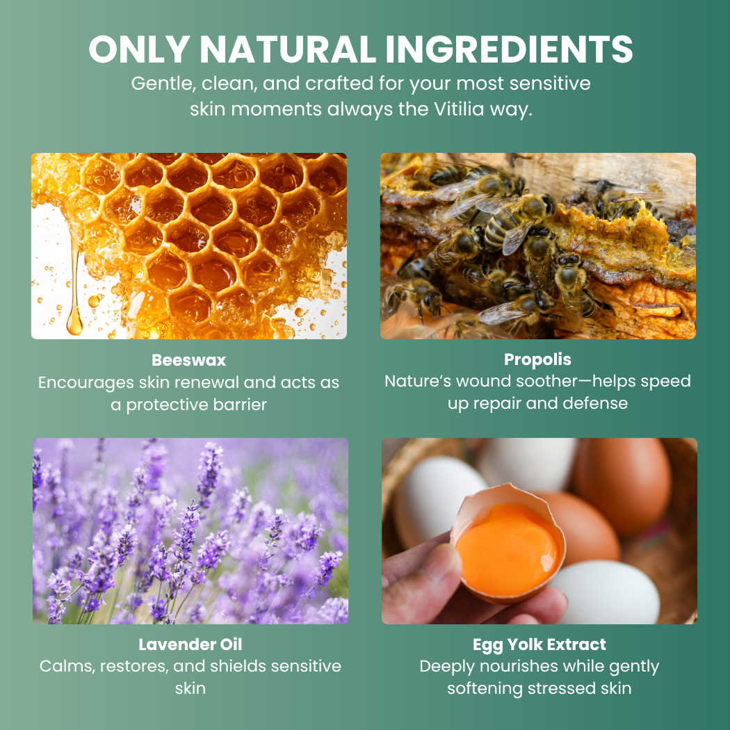 • POWERED BY EGG YOLK EXTRACT & PROPOLIS :Natural ingredients that work safely and effectively on your skin. Egg yolk deeply nourishes, while propolis supports repair and reduces discomfort.