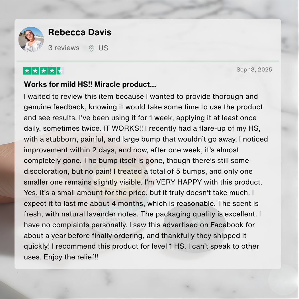 I have been waiting to review this item because I wanted to give thorough and genuine feedback, which I knew would require some time to actually use the product and wait for results. I have been using this product for 1 week. I have applied it at least once a day, sometimes 2 times a day. IT WORKS!! I was recently having a flare of my HS and I had a very stubborn one that wasn’t going away, was painful and big. I noticed a difference within 2 days but at this 1 week mark, it’s almost completely gone. The bump itself is gone, but I’m still dealing with some discoloration from it, but no pain! I applied it to 5 in total, only 1 of them are still slightly there, but it’s a smaller one. I am VERY HAPPY with this product. I saw it advertised on Facebook for like a year before I finally ordered. I do recommend this product for level 1 HS. I can’t speak to any other use. Enjoy the relief!!
